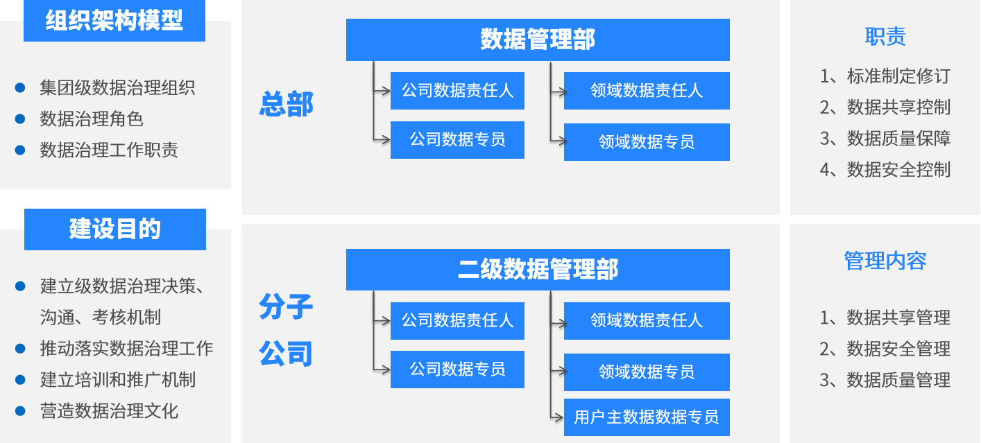 企業(yè)數據資產的常態(tài)良性運營,是“管理”+“技術”不斷迭代結合的結果,健全的數據管理組織體系及配套的管理制度是企業(yè)數據受控和順暢協(xié)同運營的保障。
