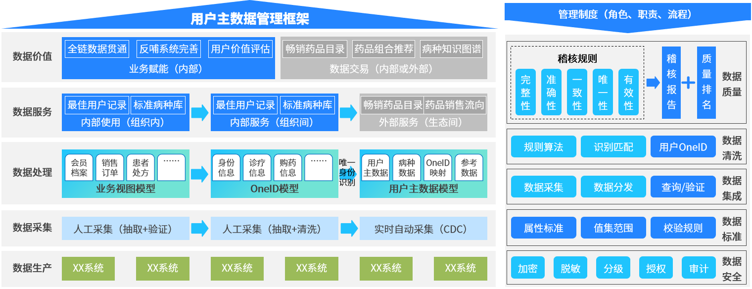 用戶主數據項目是該藥企數字化轉型基礎數據優(yōu)化階段的重要組成部分。制定數據管理制度、數據標準、優(yōu)化數據質量、數據的安全合規(guī)使用是用戶主數據項目的主要目標,同時也是用戶主數據項目的核心。通過項目建設,統(tǒng)一企業(yè)各C端業(yè)務系統(tǒng)中用戶數據標準,提升用戶數據質量,在企業(yè)內部安全合規(guī)地使用及管理用戶數據,從而支撐業(yè)務經營分析、輔助決策,發(fā)揮用戶數據價值,實現企業(yè)數字化轉型目標。