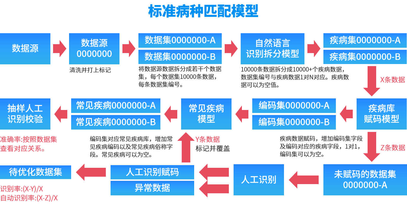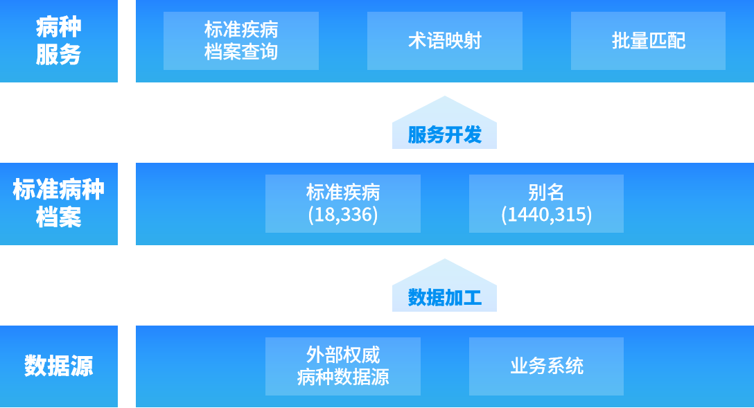 沒有統(tǒng)一標(biāo)準(zhǔn)的病種數(shù)據(jù),導(dǎo)致的核心問題主要為基于病種開展的相關(guān)數(shù)據(jù)分析復(fù)雜且不準(zhǔn)確,分析人員需要將多種不規(guī)范的病種描述轉(zhuǎn)譯成統(tǒng)一名稱開展數(shù)據(jù)分析,從而導(dǎo)致分析工作的時間周期長及分析不準(zhǔn)確的問題,因此疾病分類主數(shù)據(jù)建設(shè)的主要目標(biāo)為建立標(biāo)準(zhǔn)的疾病分類檔案庫,并可提供便捷的匹配服務(wù),以便更好地支持基于病種進(jìn)行用戶數(shù)據(jù)分析,以及后續(xù)開展病種知識庫建設(shè)形成病種知識庫建設(shè)的數(shù)據(jù)基礎(chǔ)。