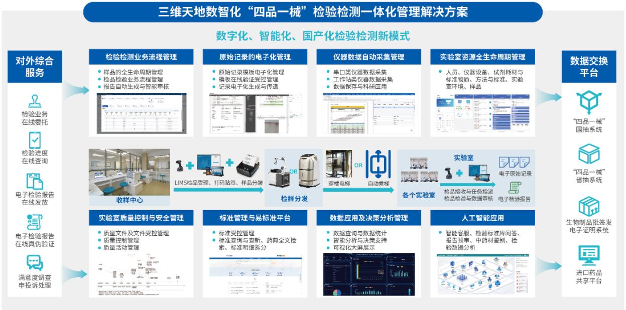 針對“四品一械”檢驗檢測機構,三維天地打造的一站式數字化解決方案(管理平臺)集檢驗檢測業(yè)務管理、原始記錄電子化管理、儀器數據自動采集管理、實驗室資源全生命周期管理、實驗室質量控制與安全管理、對外綜合服務管理等于一體,實現檢驗業(yè)務的全面數字化和標準化,正在致力于檢驗檢測機構形成全面的檢驗檢測數據資產,并充分結合大數據和人工智能技術,為質量安全監(jiān)管賦能。