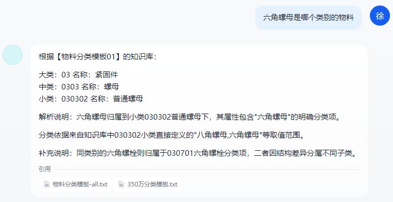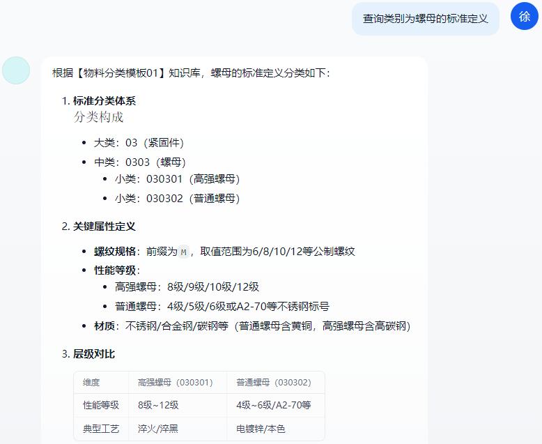 智能問(wèn)答交互:用戶(hù)只需通過(guò)自然語(yǔ)言輸入問(wèn)題(如“查詢(xún)類(lèi)別為xxx的標(biāo)準(zhǔn)定義”、“根據(jù)物料長(zhǎng)描述xxx推薦物料分類(lèi)”),系統(tǒng)自動(dòng)解析問(wèn)題并精準(zhǔn)匹配知識(shí)庫(kù)中的物料標(biāo)準(zhǔn)信息,無(wú)需復(fù)雜操作。